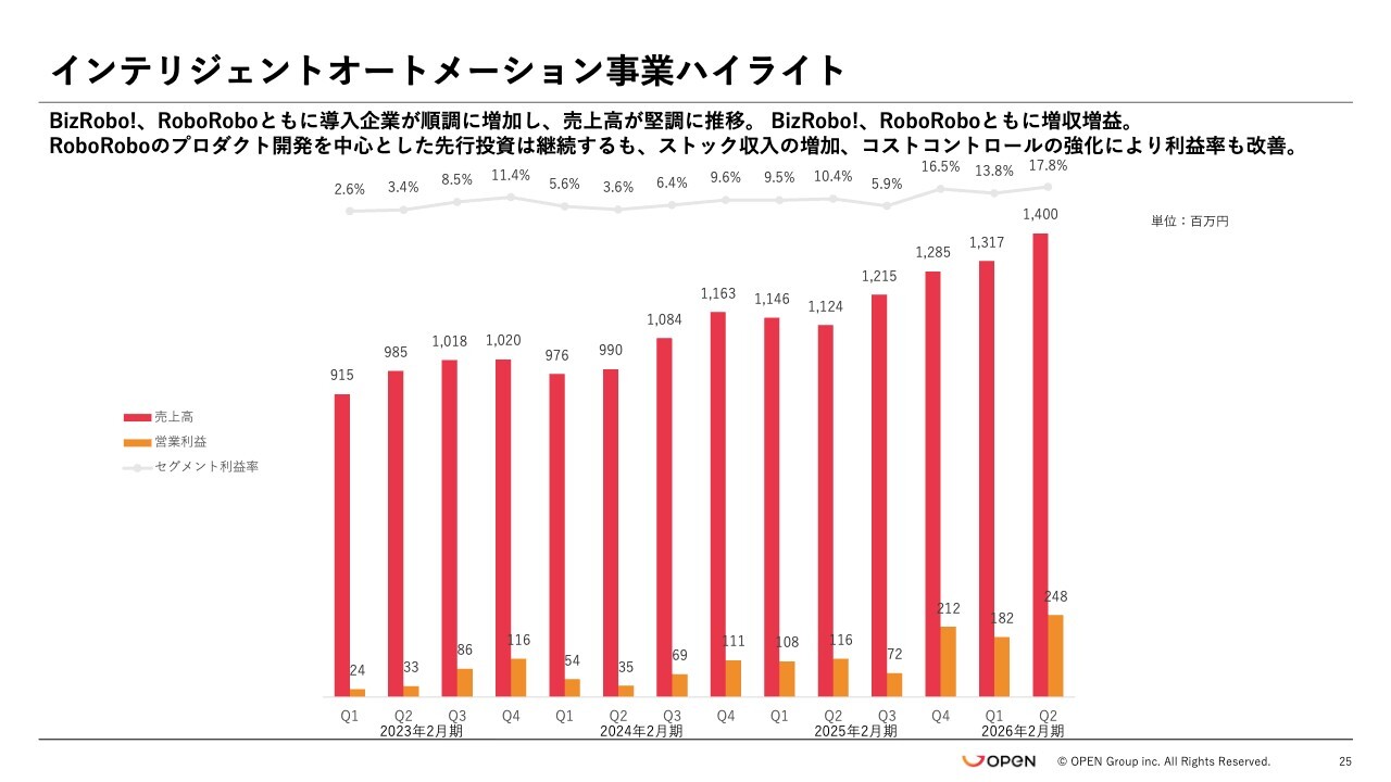 高橋:インテリジェントオートメーション事業については、「BizRobo!」「RoboRobo」ともにストックが積み上がっています。コストコントロールもしっかりと行えているため、利益率も改善しています。