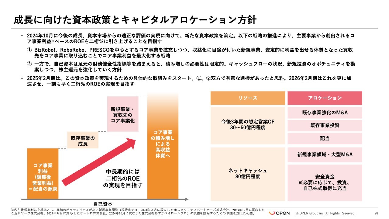 残ったネットキャッシュや営業キャッシュフローについては、既存事業を強化するための投資やM&Aに充当します。これにより利益が出るように整えたうえで、コア事業に積み上げていくというかたちでの成長を目指した資本政策とキャピタルアロケーションの方針です。