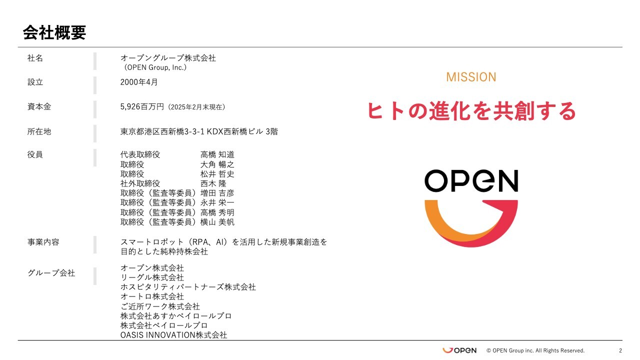 高橋知道氏(以下、高橋):オープングループ株式会社代表取締役の高橋です。本日はご多忙のところ、当社のIRセミナーにご参加いただきありがとうございます。会社の概要をご説明します。