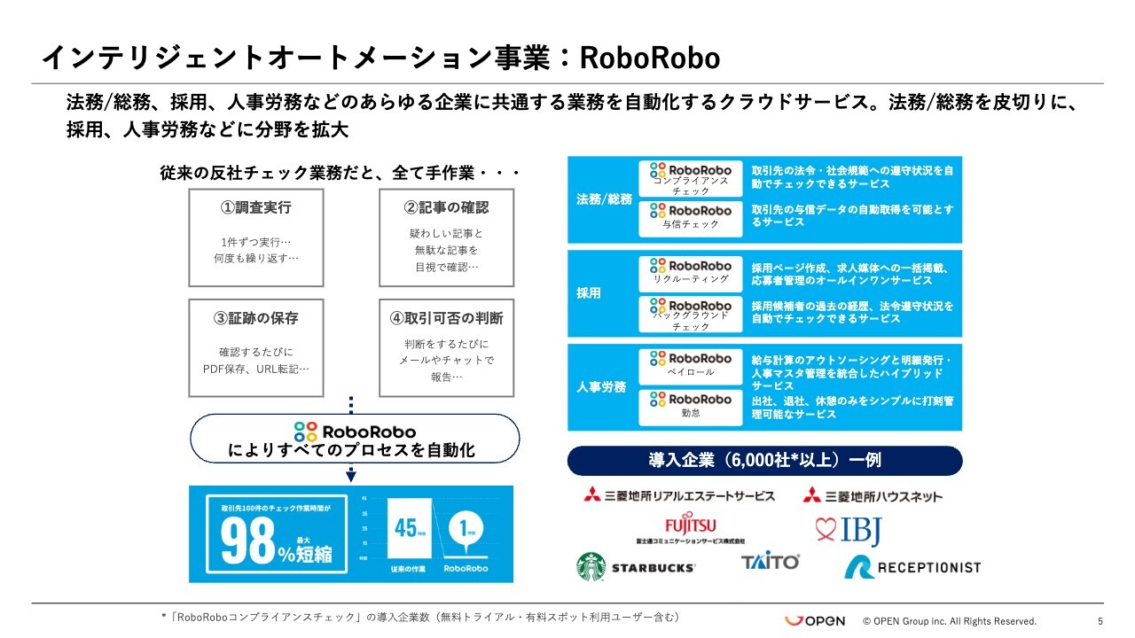 高橋:「BizRobo!」が企業の個別業務をオートメーション化するツールを提供するのに対し、「RoboRobo」では、法務や総務、採用や人事関係といった各社で共通する業務について、当社がまとめてクラウドでサービスを提供しています。