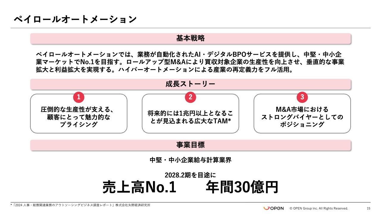 石井:ペイロールオートメーション事業の戦略についてご説明します。この事業では、いわゆるハイパーオートメーションの概念に基づき、従来の労働集約的だった給与計算業務を完全にデジタル化することで、顧客にとって安価で高品質なサービスを提供するアプローチを採用しています。