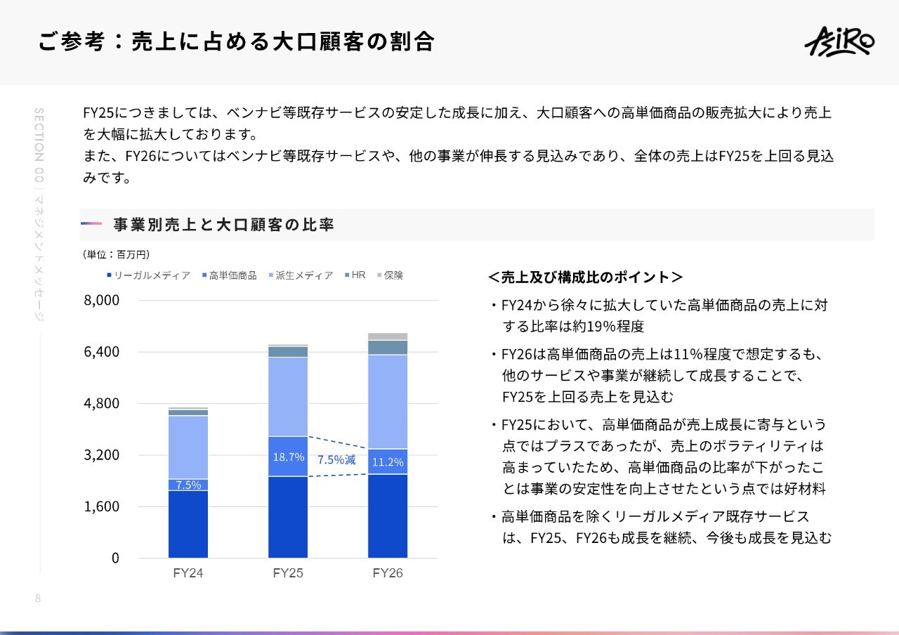 中山:売上全体のボリュームを上げ、大口顧客の比率を下げることが重要と考えています。例えば、みなさまが弊社の株や他のさまざまな金融商品をお持ちの場合、特定の銘柄に集中させると、そのボラティリティが顕著になった場合、大きな影響が生じると思います。