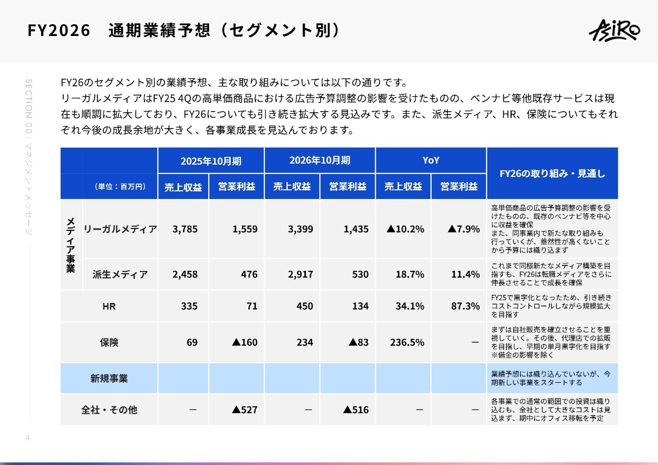 中山:セグメント別の通期業績予想はスライドのとおりです。現在、新規事業に取り組んでおり、2026年10月期において最も重要なのは、この新たなセグメントで確実に数字を生み出すことだと思っています。既存事業の成長はもちろんのこと、この新規事業の創発が、我々にとって非常に重要だと考えています。
