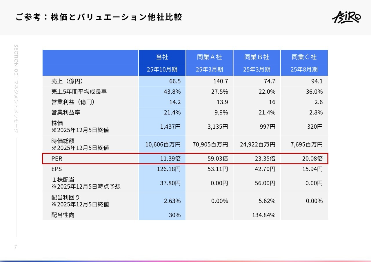 中山:株主還元についてです。同業他社と比較して弊社のPERが非常に低く、株価が割安であると感じています。そのため株主還元をさらに充実させ、この割安な状態を是正する目的も含めて、今期中に期間を定め、最大5億円までの自社株買いを進める予定です。