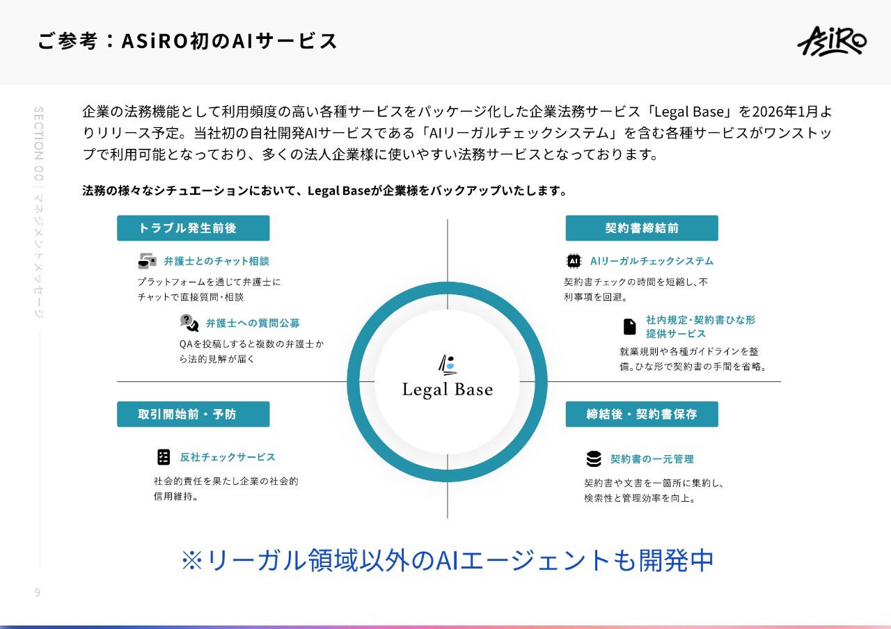 今後については、冒頭で触れた「Legal Base」というアシロ初のAIサービスを、2026年の年明けにもリリースする予定です。