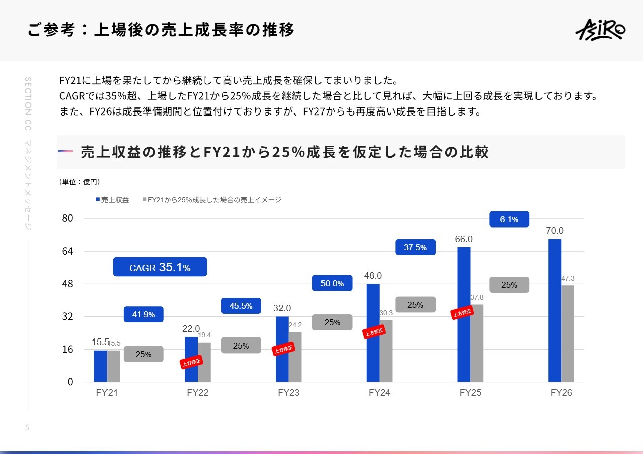 中山:成長が鈍化しているように見える部分について、こちらのスライドをご用意しました。弊社は上場以来、CAGR(年平均成長率)25パーセントを常に上回る成長を続けており、非常に高い成長速度を維持してきました。特に2024年度や2025年度については、売上成長率がやや高すぎた部分もあったと考えています。