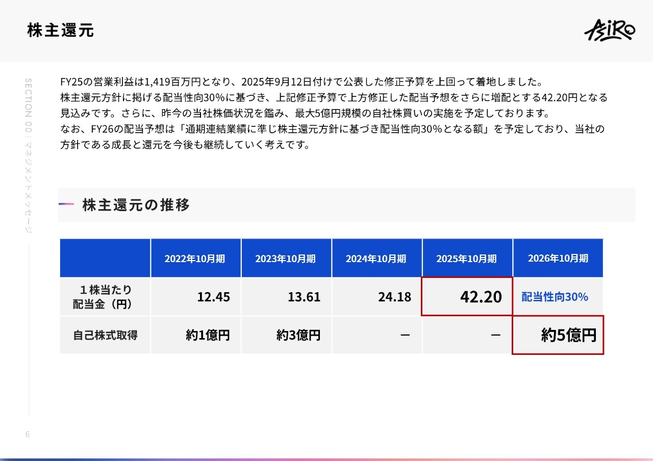 中山博登氏(以下、中山):株式会社アシロ代表取締役社長の中山博登です。2025年10月期本決算の説明会をご覧いただき、誠にありがとうございます。