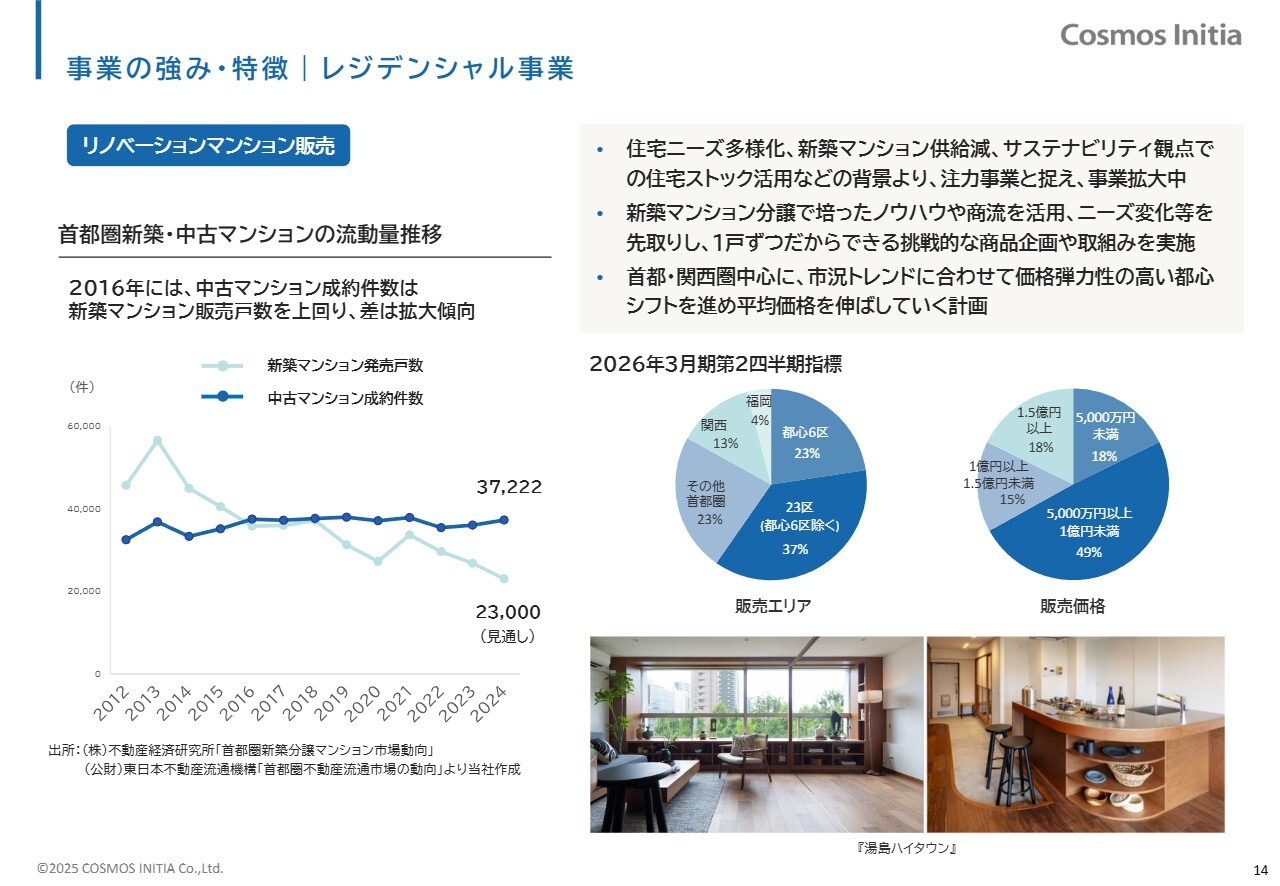 当社はリノベーションマンションの事業を拡大しています。これは1戸ずつ購入してリノベーションを施し、販売する事業です。都市のストックを有効活用するという観点でも意義深いものとなっています。そのような取り組みも積み重なり、レジデンシャル事業でもわずかながら売上が増加しています。