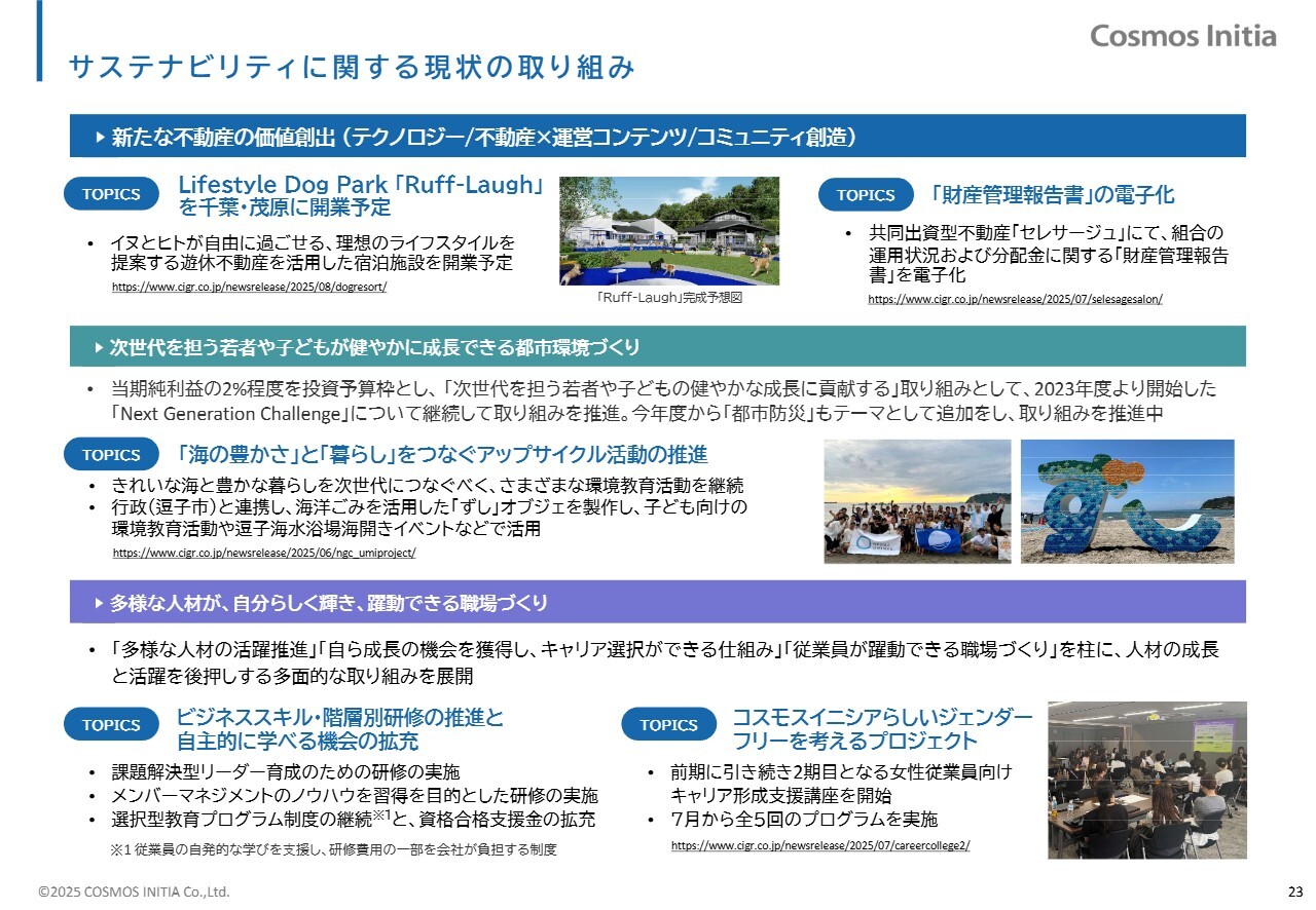 髙智:サステナビリティに関する取り組みについて、スライドにいくつか具体例を記載しています。新たな不動産の価値創出として、千葉県茂原市で犬と人が自由に過ごし宿泊もできるドッグパーク「Ruff-Laugh」を企画しており、2026年春にオープン予定です。ぜひご注目ください。