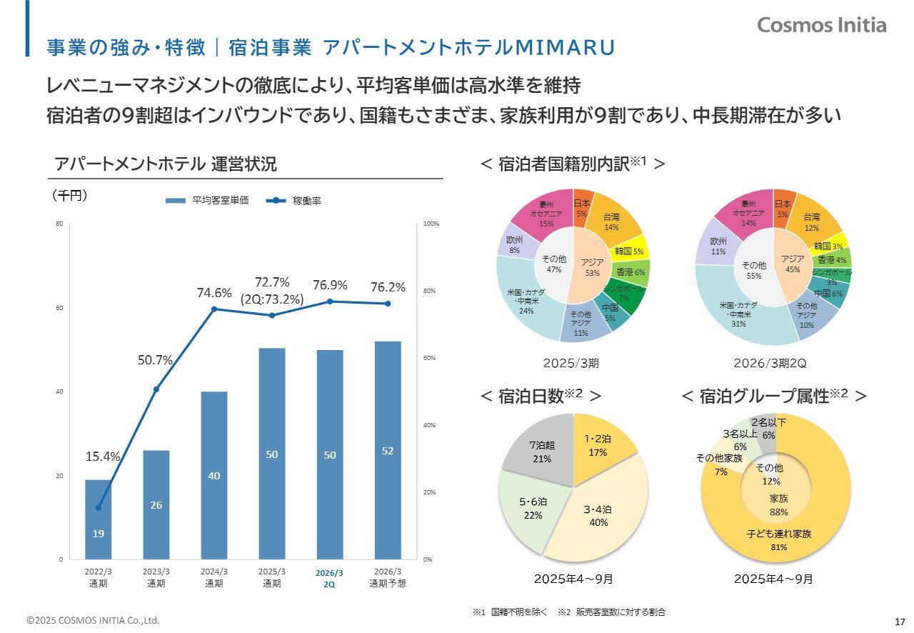 髙智:こちらは、アパートメントホテルの運営状況と、どのようなお客さまにご利用いただいているかの説明です。スライド左側の折れ線グラフをご覧ください。稼働率は76パーセントですが、他のホテルは90パーセント程度に達することが多いため、少し低いのではないかと指摘をいただくことがあります。