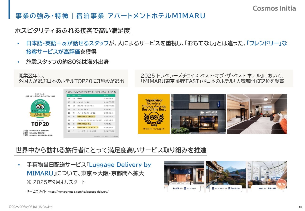 髙智:スライド下部に「Luggage Delivery by MIMARU」の記載があります。大きな荷物を持って来られる方やお子さま連れの方が多く、「荷物の移動が大変だ」ということで、空港からホテルまで、あるいは東京から大阪のホテルまで、当社が代わりにカバンをお送りします。このサービスが非常に好評で、みなさまが身軽に移動できるようお手伝いしています。