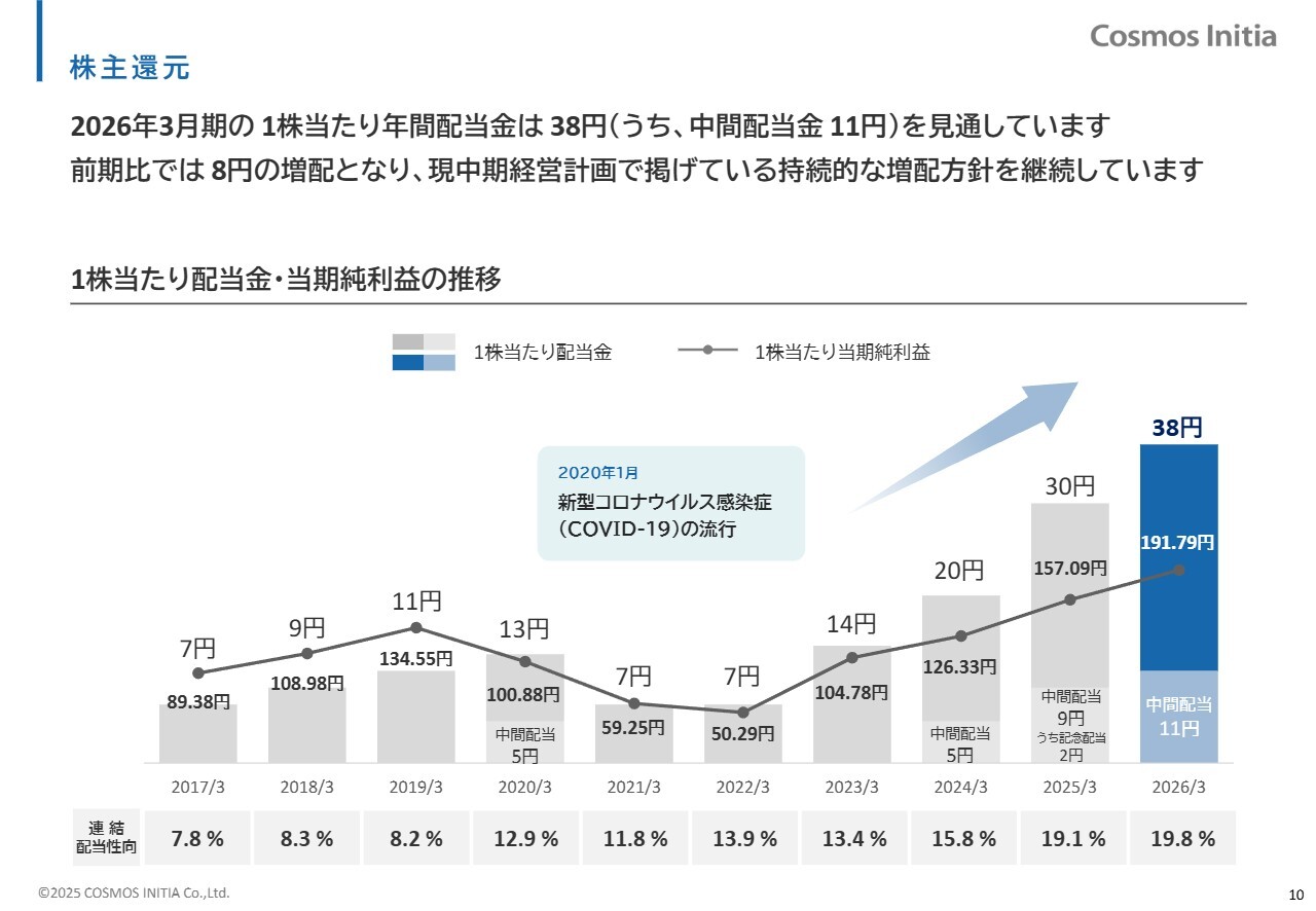 髙智:現中期経営計画では、配当について継続的かつ持続的な増配方針を掲げ、利益成長を図りながら配当を着実に増やしてきました。