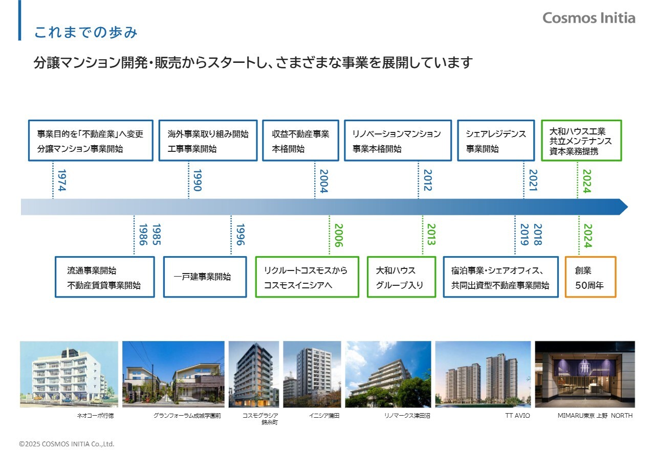 髙智:これまでの歩みです。私たちは1974年、51年前に分譲マンションの開発事業からスタートしました。それ以降、10万戸以上のマンションを供給してきました。