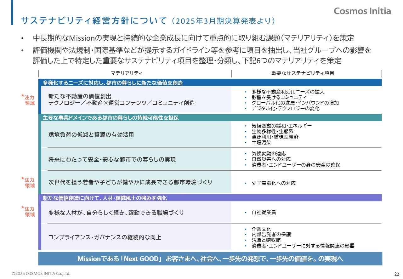 髙智:当社のサステナビリティ経営方針では、中長期的なMissionの実現と持続的な企業成長に向けて、重点的に取り組むべきマテリアリティを整理し、重要なサステナビリティ項目を定めています。