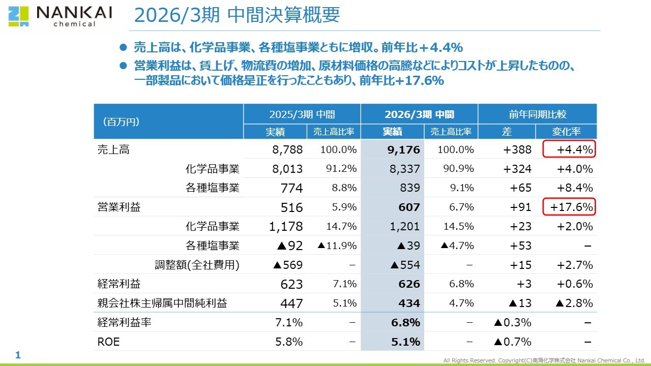 杉岡伸也氏(以下、杉岡):南海化学株式会社代表取締役社長執行役員の杉岡です。本日は、当社の中間決算説明会にご参加いただき、誠にありがとうございます。