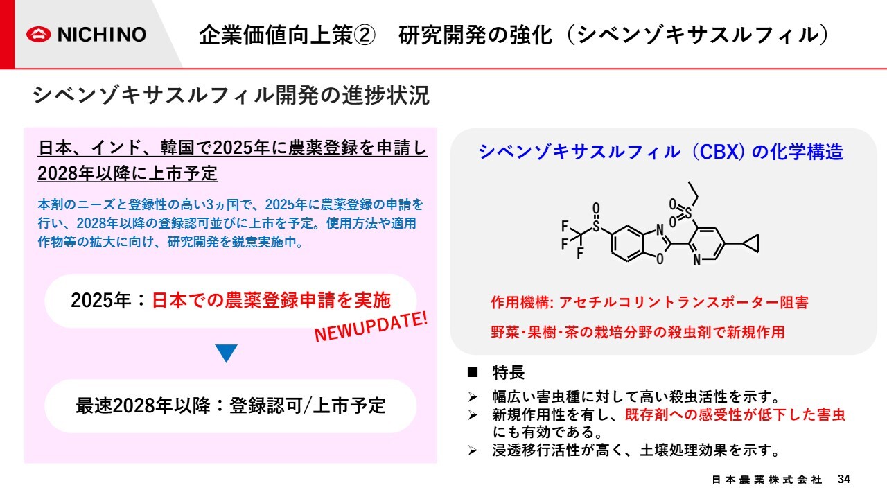 研究開発強化の取り組みについて、「シベンゾキサスルフィル」(略称:「CBX」)の開発進捗をご紹介します。