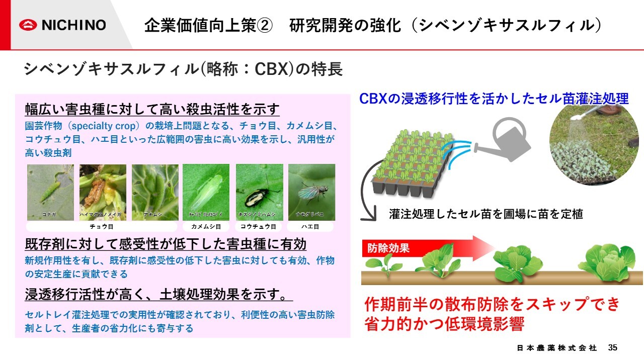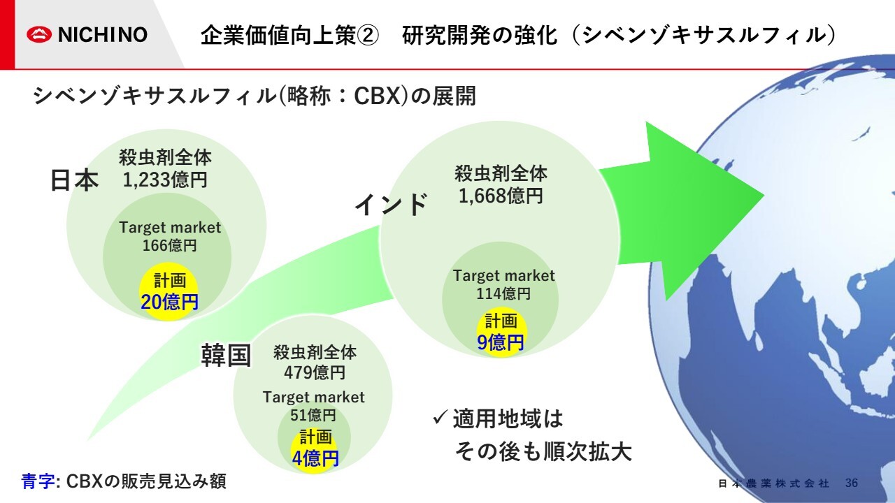 「CBX」は、2028年の登録・上市を目指し、日本、インド、韓国で積極的に開発を進めています。先般、日本での農薬登録の申請を実施しました。