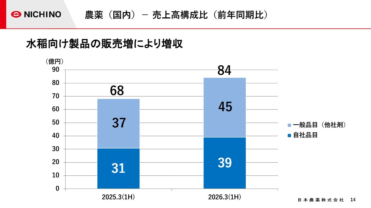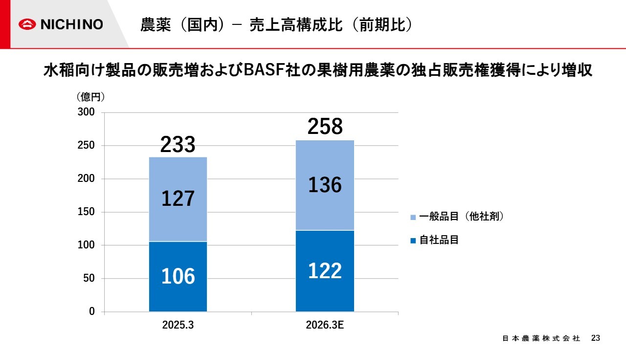 スライドのグラフは、今期の国内農薬販売の売上高構成比を示しています。今期は、水稲向け製品の自社品目の普及拡販や、一般品目ではBASF社の果樹向け農薬販売等、他社からの導入品の拡大により、売上高は258億円と、前期比で増収の見通しです。