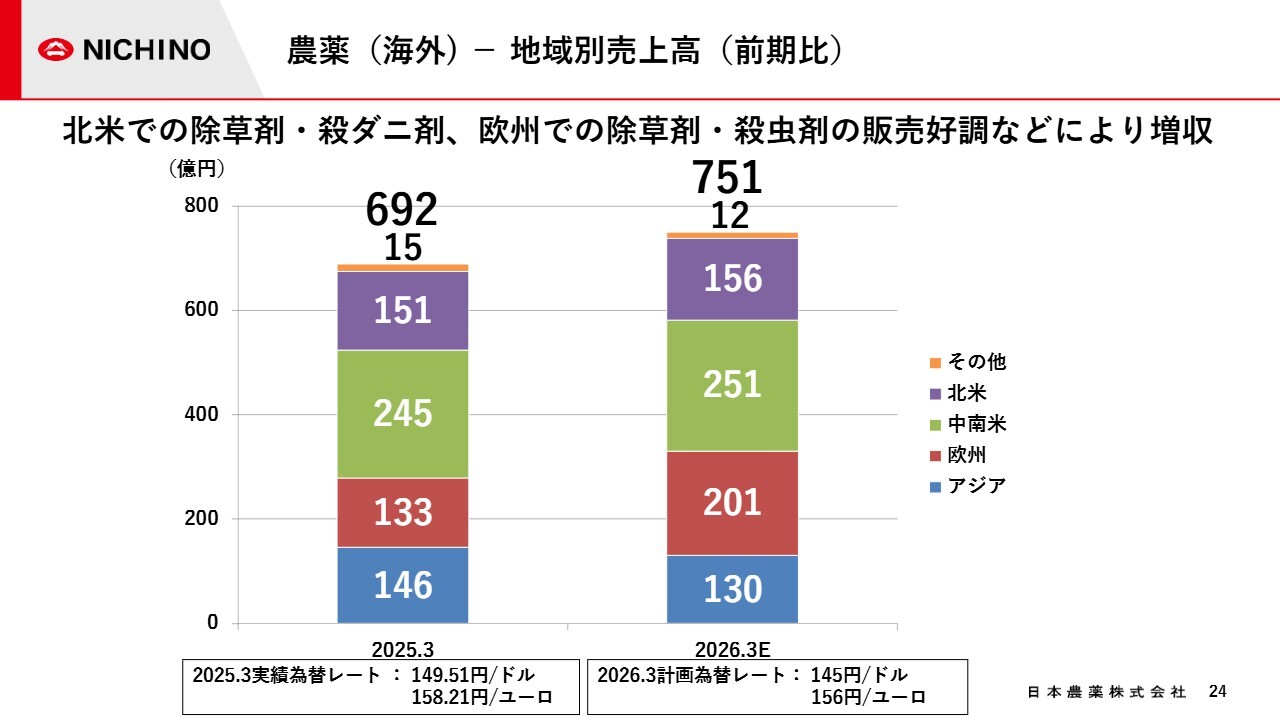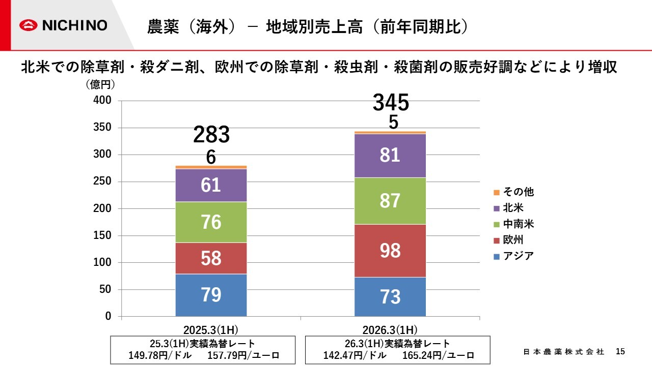 スライドのグラフは、今期の海外農薬販売の地域別売上高を示したものです。赤色で示した欧州と、紫色で示した北米は引き続き好調で、増収が見込んでいます。