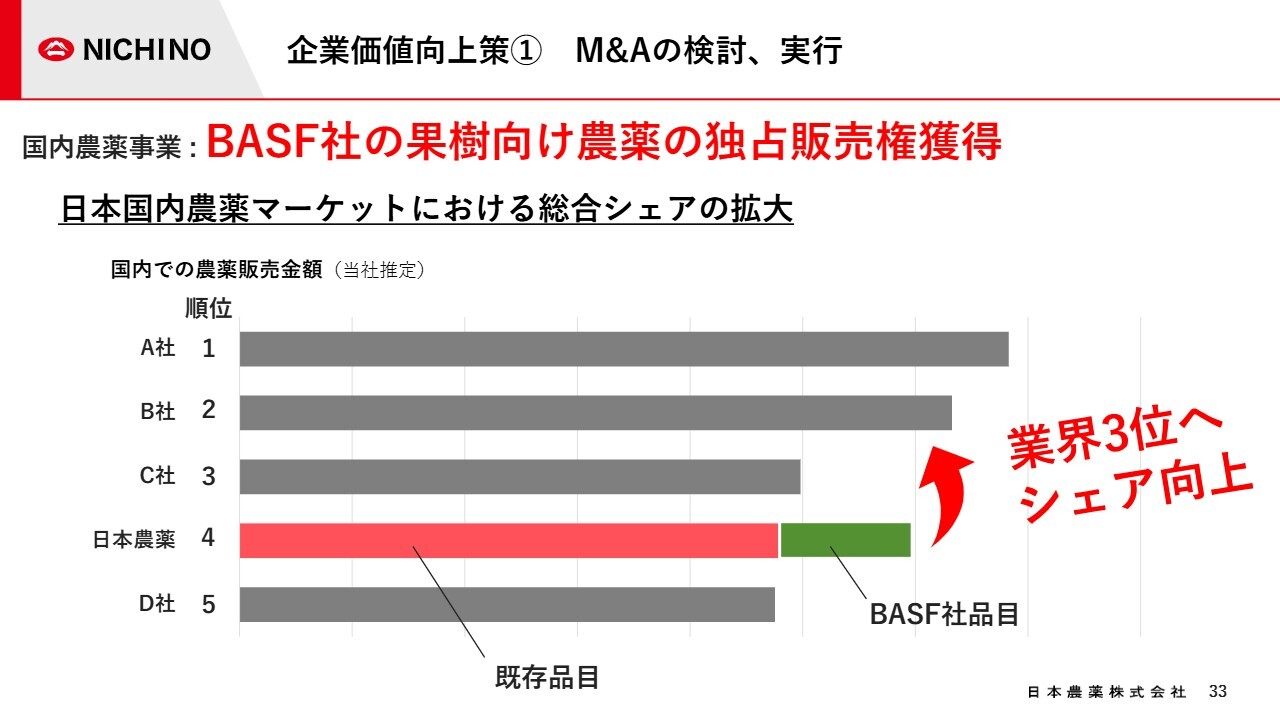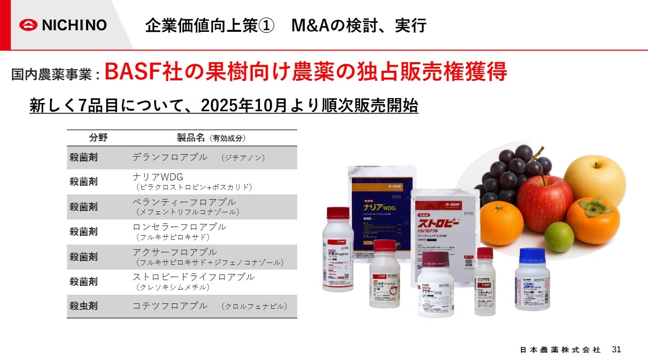 その中で、今回のBASF社の果樹向け農薬の権利獲得や、4年前に実施されたコルテバ社との戦略的パートナーシップなど、これらはすべて国内に普及基盤を持つ当社が受け皿となり、将来的な展開を図るための方針に基づくものです。
