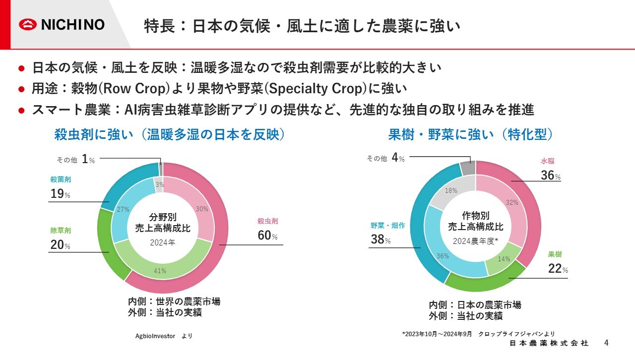 当社の特長です。スライド左側のグラフは、内側が世界の農薬市場における分野別売上高構成比、外側が当社の売上高構成比を示しています。当社は温暖多湿な日本の気候を反映し、特に殺虫剤を得意としています。