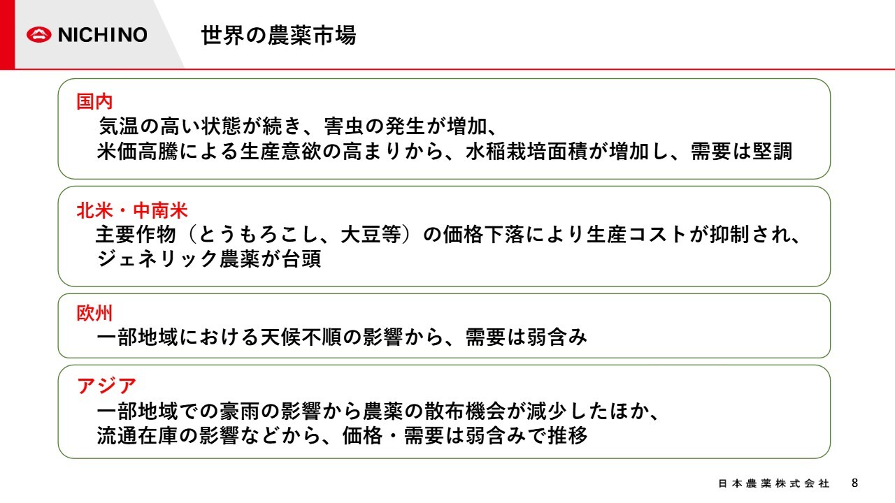 世界の農薬市場について地域別にご説明します。国内では、気温の高い状態が続き、カメムシやチョウ目などの害虫の発生が増加したことや、米価高騰による水稲作付面積の増加の影響などから、農薬需要は堅調に推移しました。