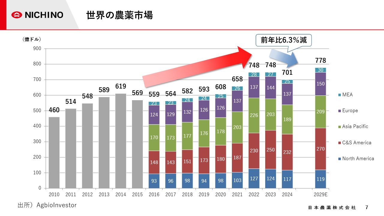 世界の農薬市場は、米州などの需要増加からここ数年拡大基調にありましたが、2024年には価格の下落、悪天候、流通在庫増加により大きな影響を受けた結果、前年比6.3パーセント減の701億ドルとなりました。