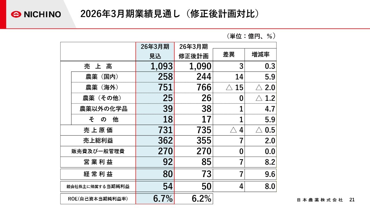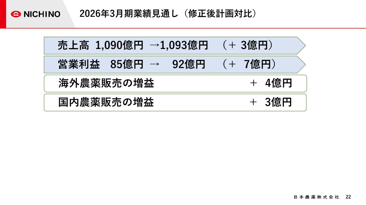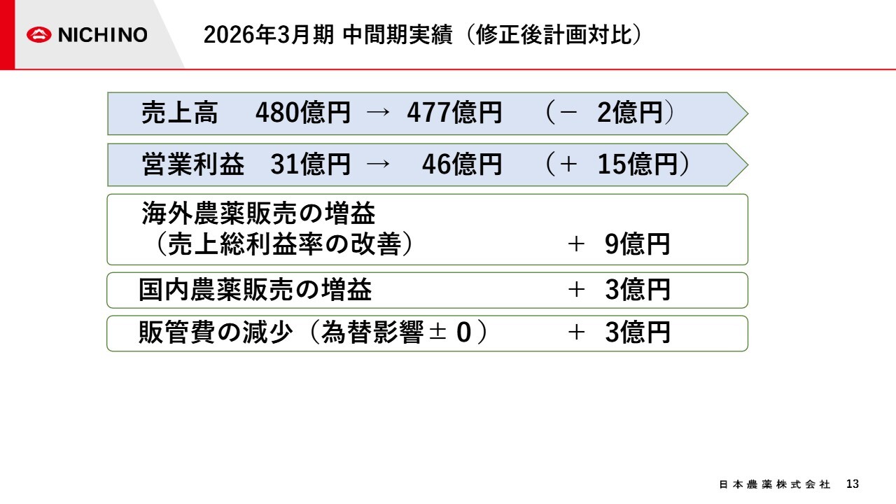 修正後計画と比較した、営業利益の増加要因をご説明します。海外農薬販売で9億円、国内農薬販売で3億円、研究開発費が一部下期に後ずれしたことによる販管費の減少で3億円となり、合計で15億円の増益となりました。
