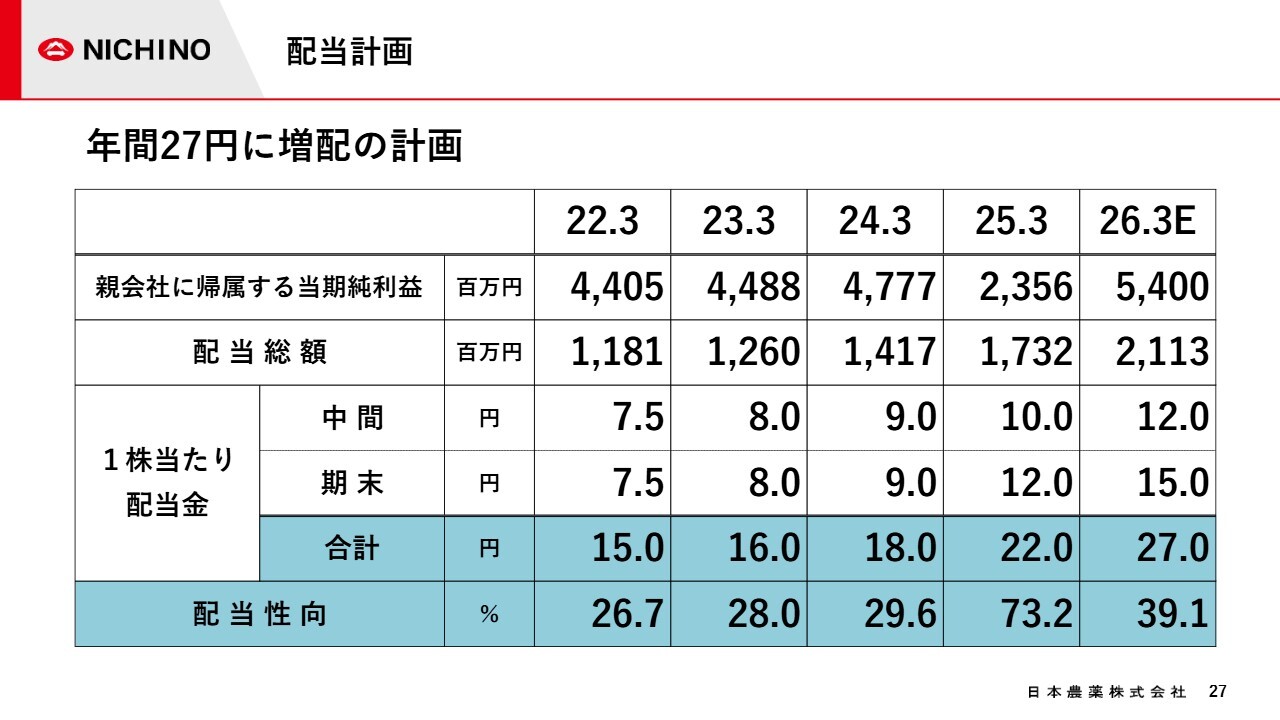 今回の業績上方修正に伴い、「累進配当を基本とし、配当性向40パーセントを目安に配当を行う」という中期経営計画の配当方針に基づき、期末配当金を2円増配することとしました。この結果、年間配当は27円となる見込みです。