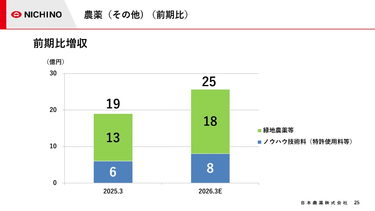 スライドのグラフは、農薬事業に関するノウハウ技術料や、緑地農薬等の今期の見通しを表しています。今期は、ノウハウ技術料も緑地農薬等も、前期比で増収となる見通しです。