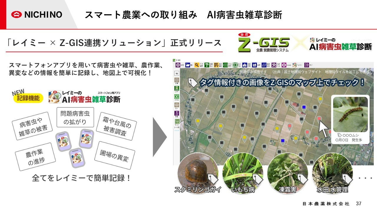 スマート農業への取り組みをご紹介します。当社はスマートフォンアプリ「レイミーのAI病害虫雑草診断」と、JA全農の営農管理システム「Z-GIS」を連携させた新たなソリューションを正式にリリースしました。