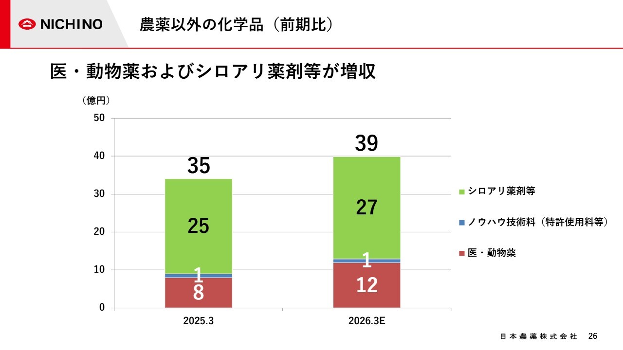 スライドのグラフは、農薬以外の化学品に関する今期の見通しを表しています。今期は、医薬・動物薬も、シロアリ薬剤等も増収となる見通しです。