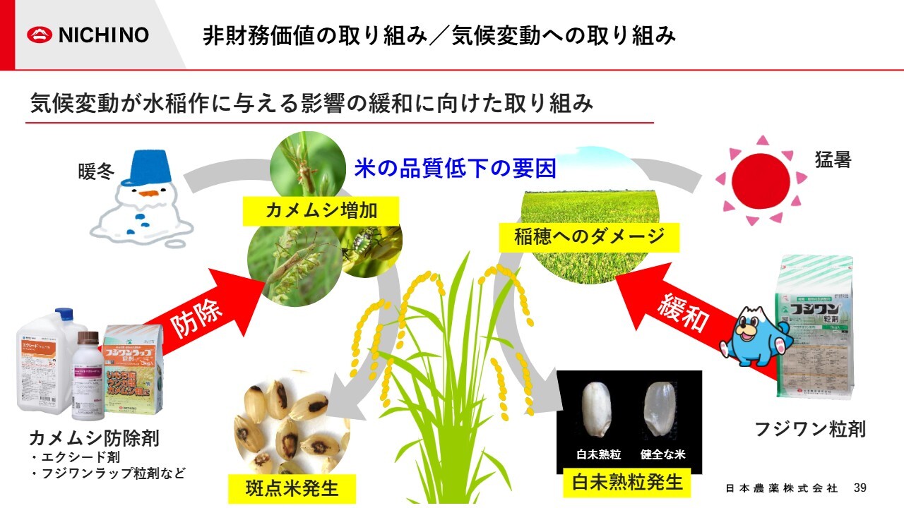 当社は、暖冬によるカメムシ被害の増加に対しては、カメムシ防除剤を普及しています。猛暑による白未熟粒の発生には、高温障害緩和の効果がある「フジワン粒剤」を普及しています。なお、「フジワン」は当社初の自社開発品であり、販売から50年を迎えました。