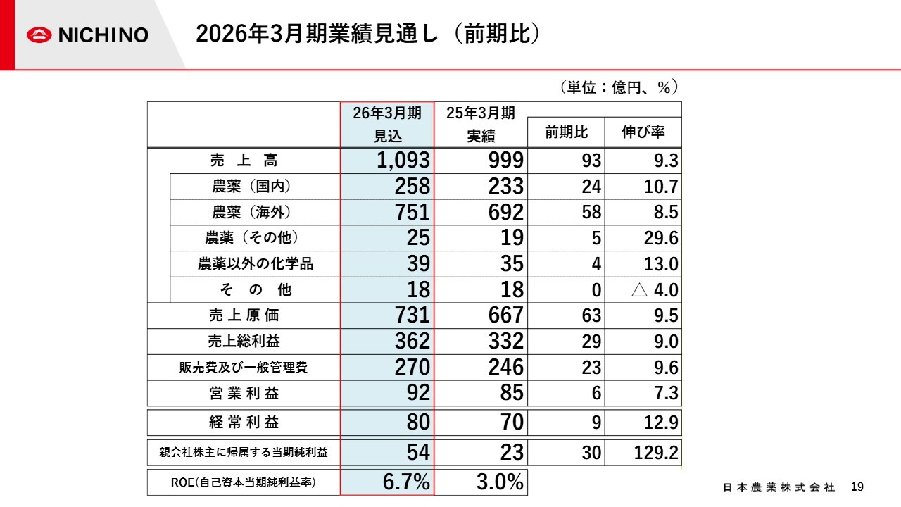 中核事業である農薬事業の伸長を主要因に、売上高は1,093億円で、前期比93億円、9.3パーセントの増収を見込んでいます。
