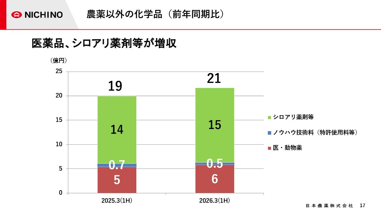 スライドのグラフは、農薬以外の化学品事業について、赤色の医薬・動物薬、青色のノウハウ技術料、緑色のシロアリ薬剤等に区分して実績を示したものです。当中間期の売上高は、前年同期比で微増となりました。