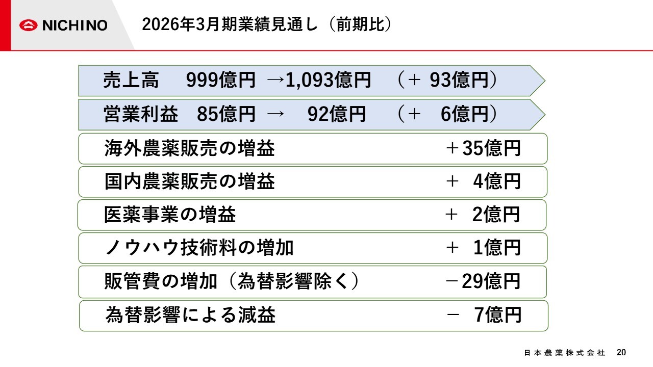 営業利益の増減要因は、欧米を中心とした海外農薬販売の増益で4億円、国内農薬販売の増益で3億円となっています。