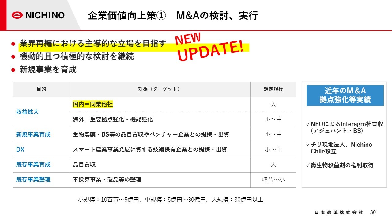 中期経営計画における企業価値向上策として、M&Aの検討や実行を掲げており、業界再編において主導的な役割を果たすことを目指しています。