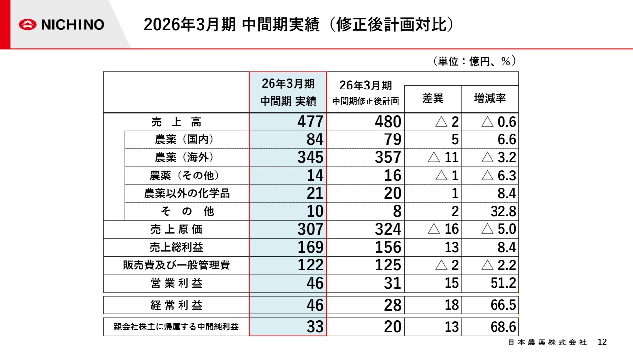 2026年3月期中間期実績についてご説明します。売上高は、中核事業である農薬事業が好調で、前年同期比を2割強上回る結果となりました。
