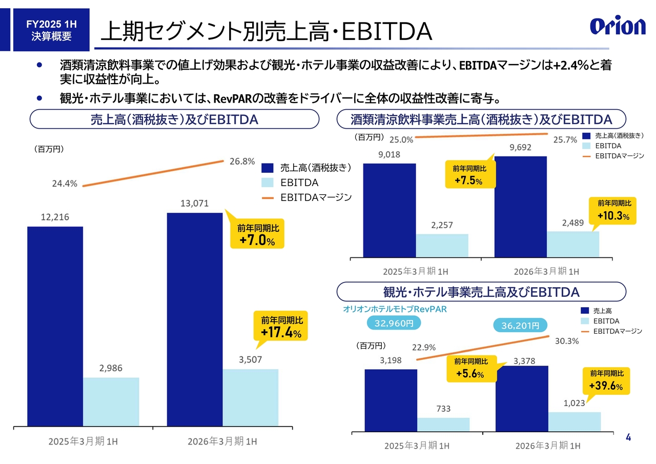 酒類清涼飲料事業では、4月に実施した価格改定、つまり値上げの効果がありました。また、観光・ホテル事業ではRevPARが約3万3,000円から3万6,000円へ改善しています。これらが売上拡大の要因となり、さらにコストコントロールの結果、EBITDAマージンは前年同期比でプラス2.4パーセントとなりました。