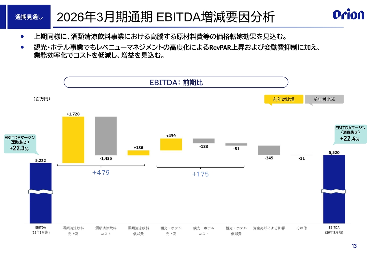 そのうち、酒類清涼飲料事業が4億7,900万円、観光・ホテル事業が1億7,500万円、増加要因として挙げられています。一方で、資産の売却による影響で2億1,500万円減少していますが、それらを相殺し、両事業の貢献によって、EBITDAは金額ベースで3億円、マージンベースで前年同期比0.1パーセント増加する見込みです。