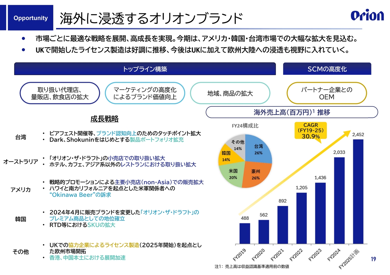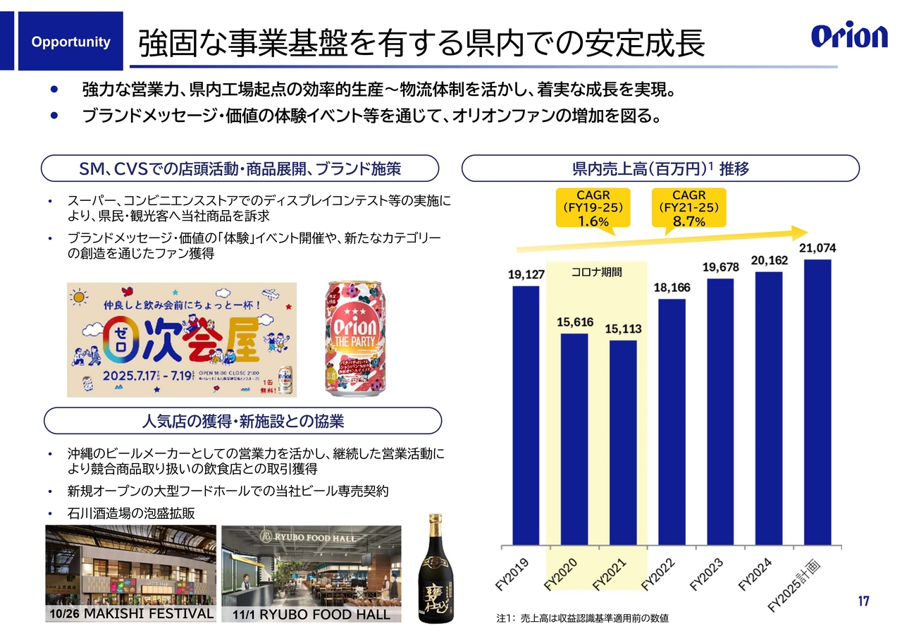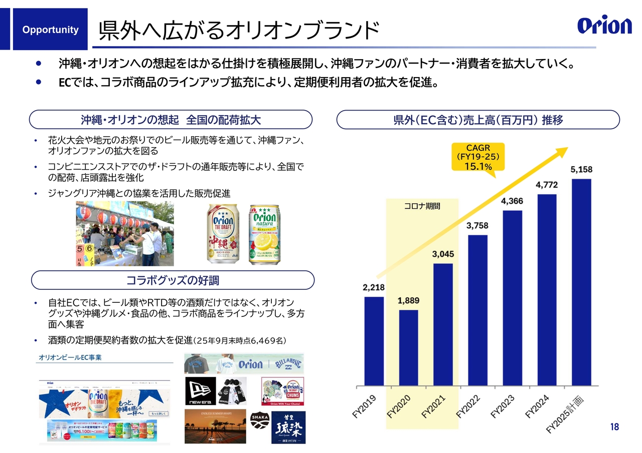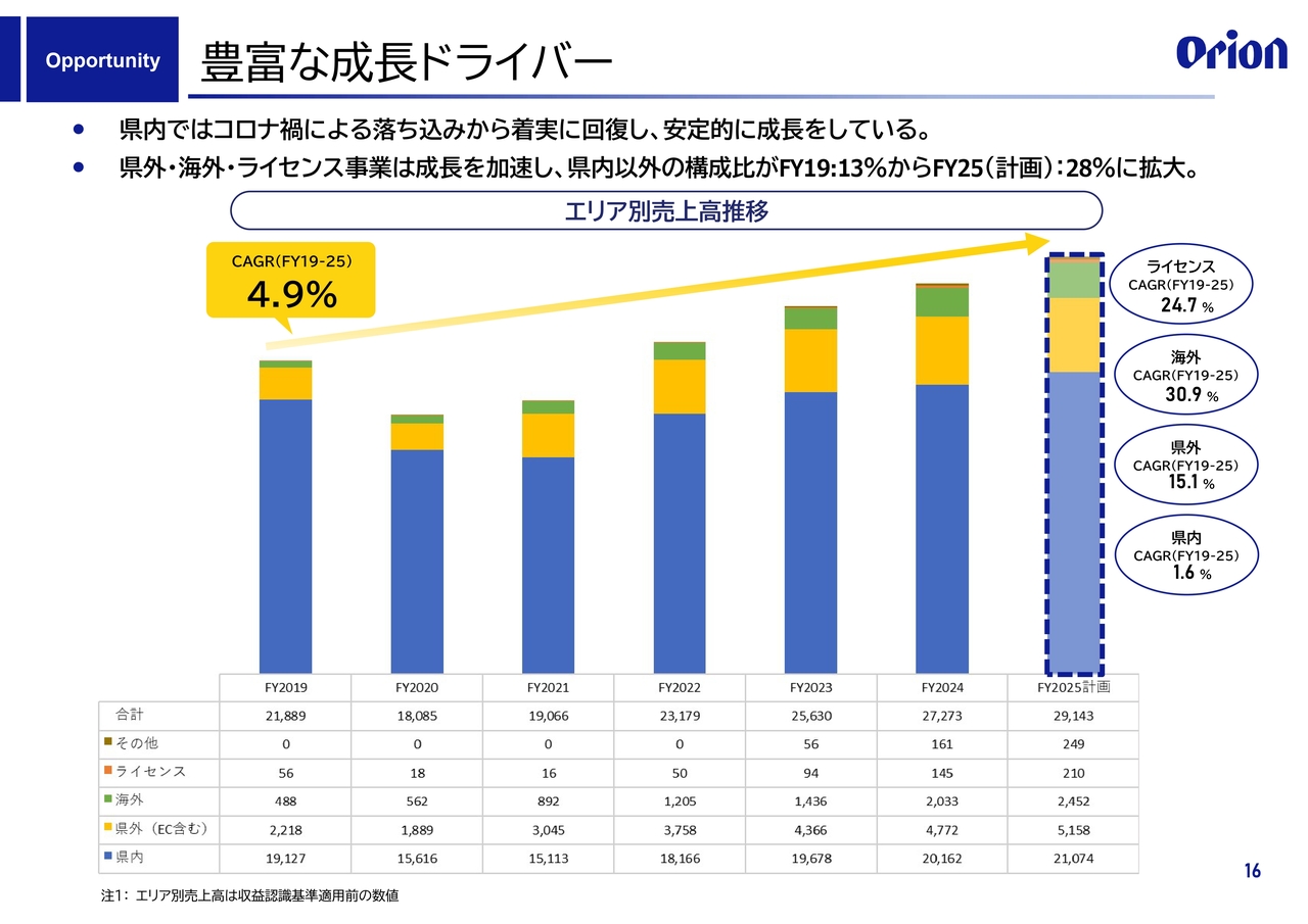 県外でもオリオンブランドの浸透を図っています。こちらは2020年度に新型コロナウイルスの影響で一時的に沈み込みましたが、その後は順調に推移し、2019年度から2025年度にかけて15.1パーセントのCAGRを達成しています。