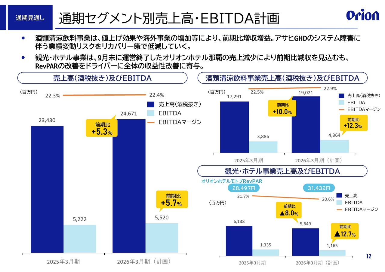 観光・ホテル事業では資産の売却などにより、売上高とEBITDAマージンが減少します。ただし、後ほど詳しく説明しますが、北部に資源を集中した結果、「オリオンホテル モトブ リゾート&スパ」のRevPAR(稼働率と客室単価で計算)は、年間ベースで2万8,497円から3万1,432円に上昇する見込みです。