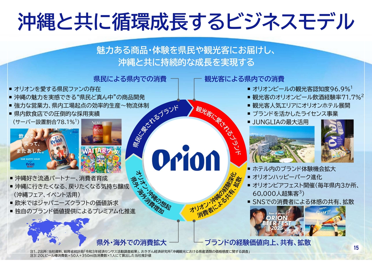 さらに、県外や海外に帰ってからも、オリオンや沖縄を想起させることによって新たな消費が促され、結果として沖縄に再び訪れたくなるという、循環成長するビジネスモデルを意識して進めています。