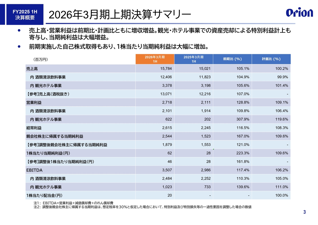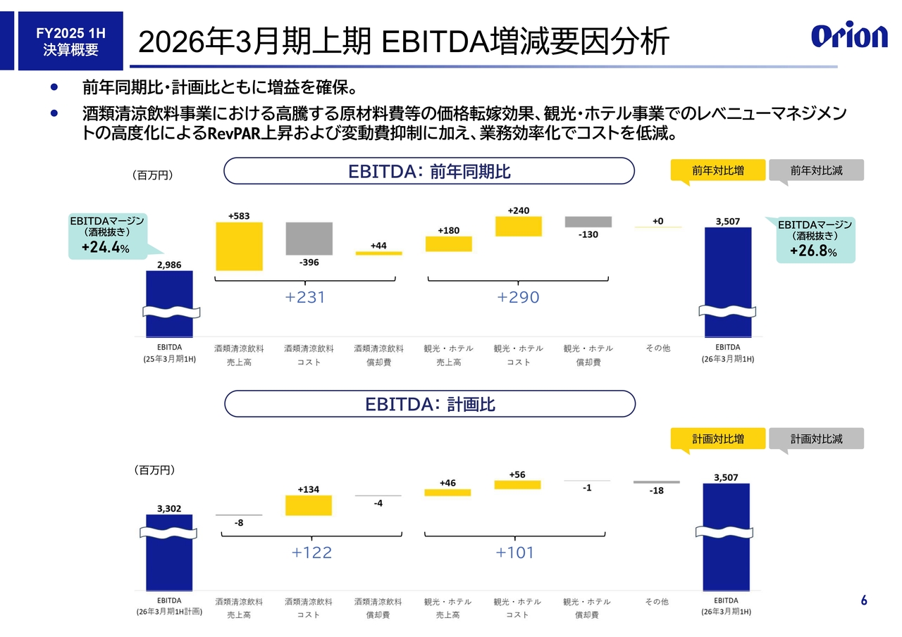 また、設備投資により約1億円の減価償却費が増加したため、観光・ホテル事業ではEBITDAが約3億円増加しました。酒類清涼飲料事業の約2億円と観光・ホテル事業の約3億円を合わせ、EBITDAは対前年比で約5億円増加となりました。