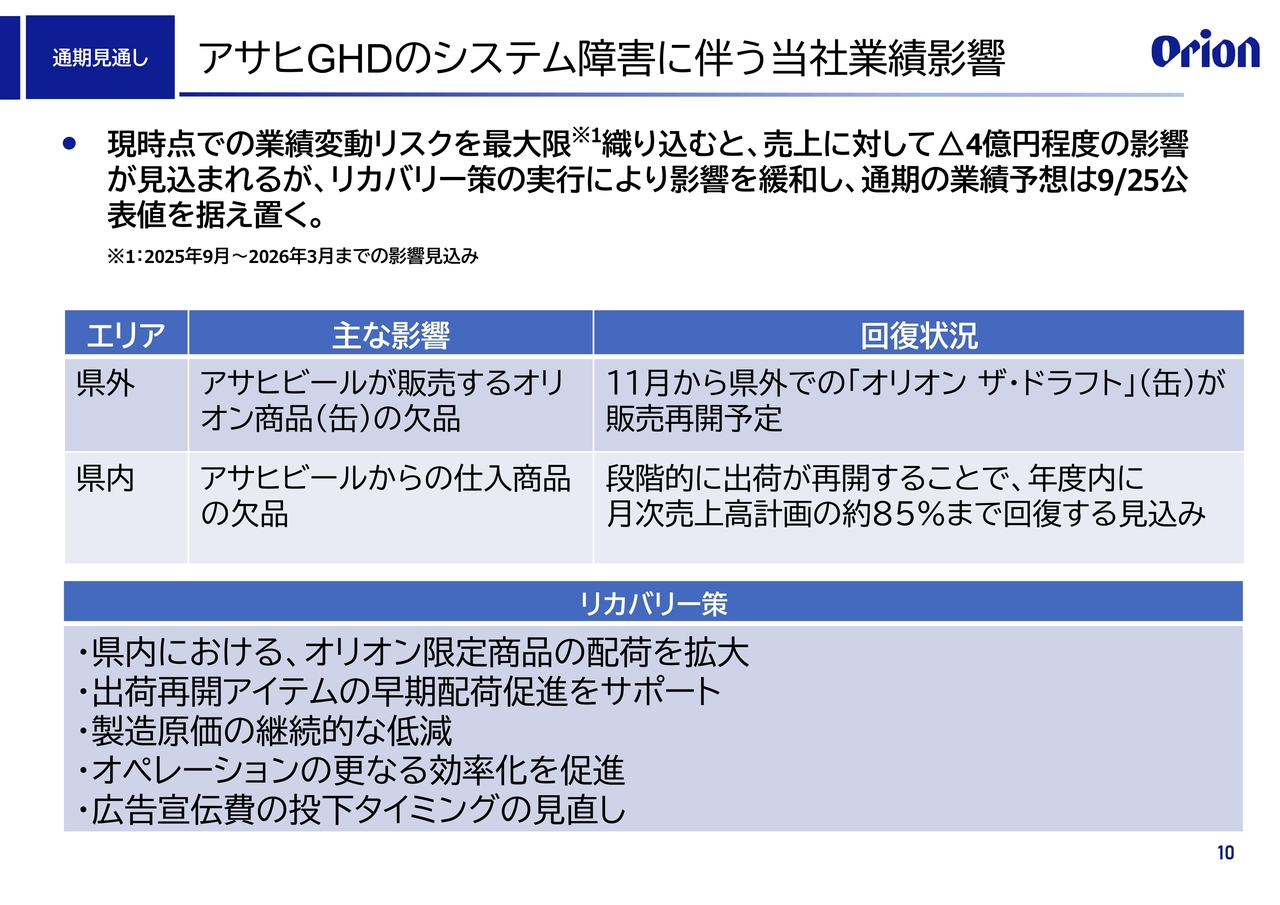リカバリー策として、4億円程度の売上減を補うため、県内でのオリオン限定商品の追加配荷や、アサヒGHDから出荷が再開されたアイテムの早期配荷を実現します。
