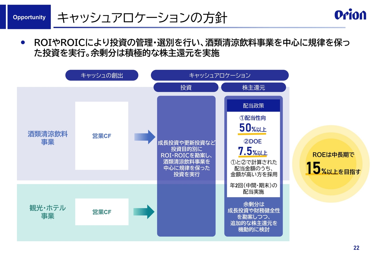 キャッシュアロケーションの方針です。こちらは変更していません。ROIやROICをしっかり管理し、規律を保った投資を主に酒類清涼飲料事業に行います。余剰キャッシュについては積極的に株主還元を行う方針です。