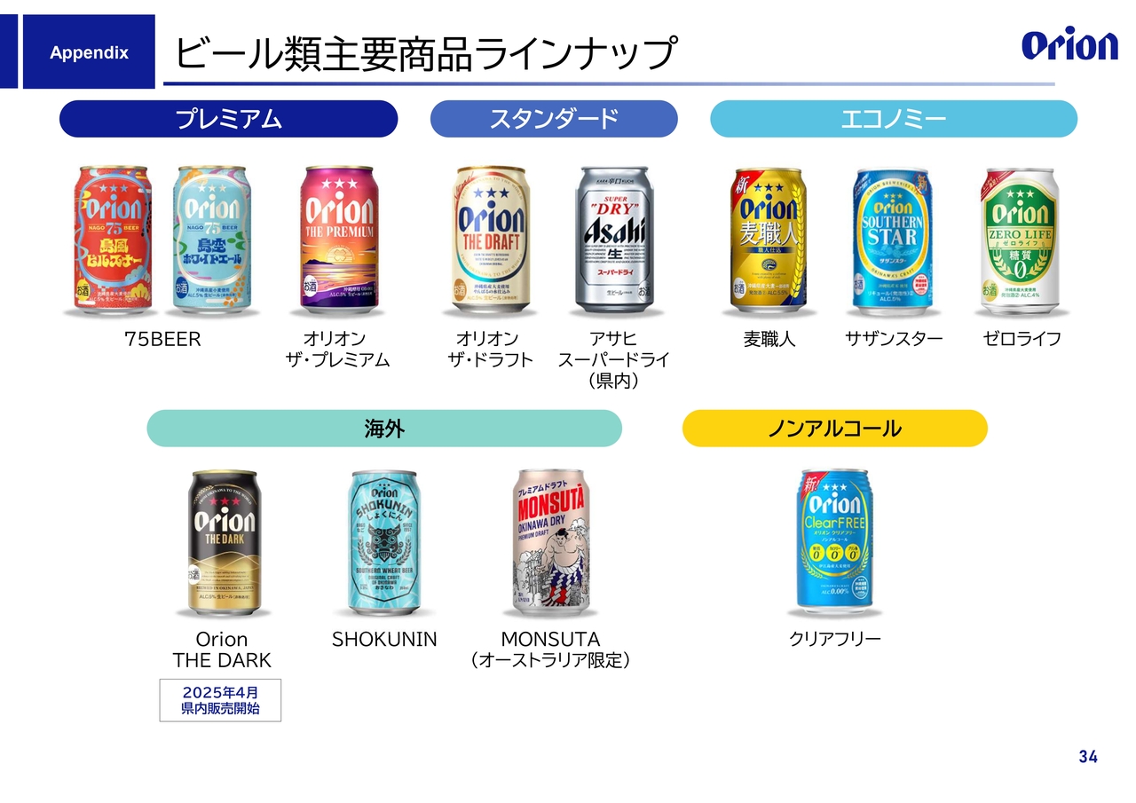また、「オリオン ザ・ドラフト」が主力商品です。数年前に、「オリオン ザ・プレミアム」という商品を価格帯でいうと中間価格帯ですが、導入しました。このように、現在、ビールは3つのラインを展開しています。この3ラインを設けた理由は、プレミアム化を見据え、ビールのラインナップを強化するためです。