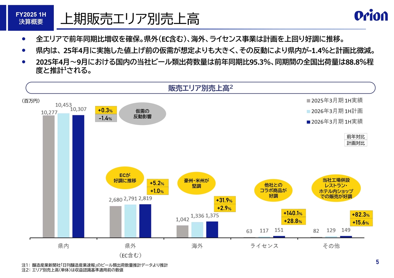 その影響で県内売上は計画比で微減となりました。ただし、この半期におけるビール類の出荷数量は、全国では前年比約89パーセントでしたが、当社は約95パーセントであり、全国平均を上回っていると推計しています。