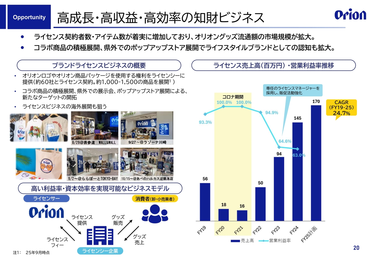 豊富な成長ドライバーの1つとして、ライセンス事業が大変好調であり、ライセンシーの数や取り扱いアイテム数が大幅に増加しています。スライド右側に掲載のとおり、昨年度のライセンス収入は1億4,500万円で、今年は計画ベースで1億7,000万円を見込んでいます。CAGRは24.7パーセントです。