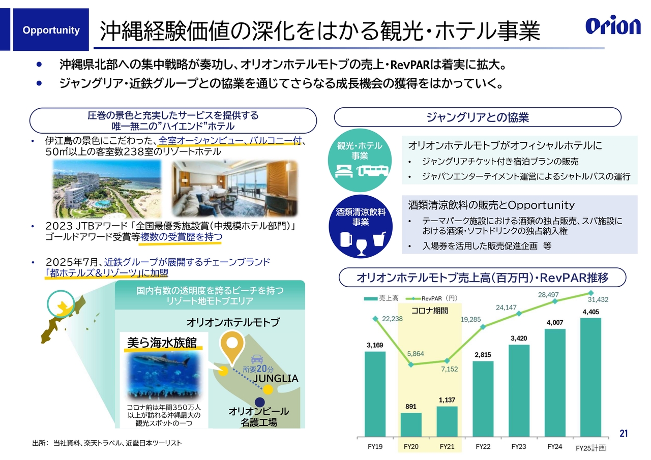 この北部集中の施策が功を奏し、スライド右下に記載があるとおり、「オリオンホテル モトブ リゾート&スパ」の売上高およびRevPARは着実に拡大しました。2024年度は過去最高でしたが、今年度はその売上高およびRevPARをさらに上回るかたちで推移しています。